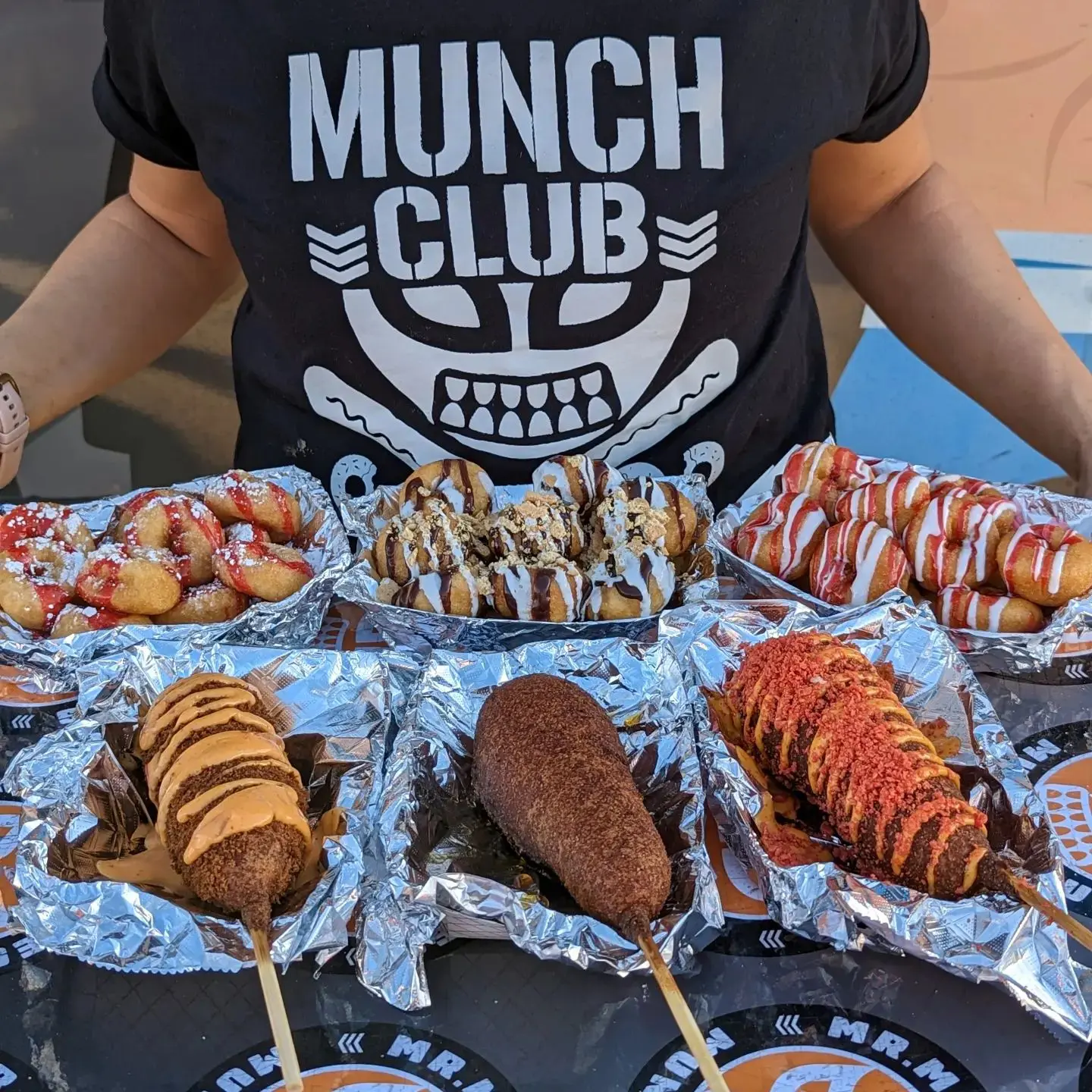 Mr. Munchies is a family owned food trailer based in Mesa, Arizona, serving the greater Phoenix area with hot, fresh mini donuts and hand dipped corn dogs. Known for its high energy wrestling theme, the trailer blends comfort food with a fun, interactive experience.
